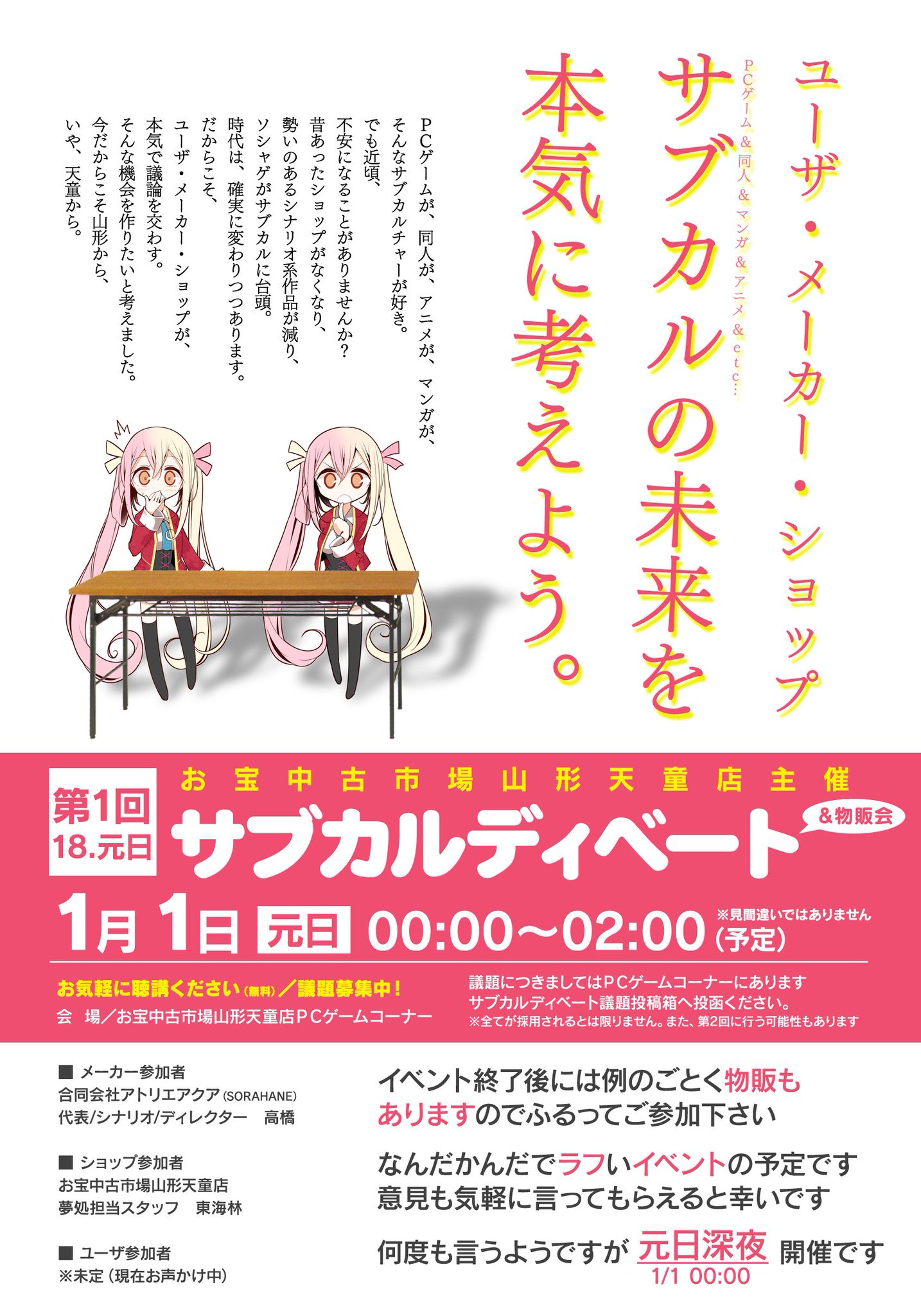 お宝中古市場山形天童店 大人の空間夢処 Sur Twitter 夢処新年最初のイベントは サブカルディベート 物販会 今だからこそ 本気で 楽しく Pcゲームやサブカル等について話し合いましょう ゲストは Sorahaneの代表さんです ディベートのお題も店頭で募集